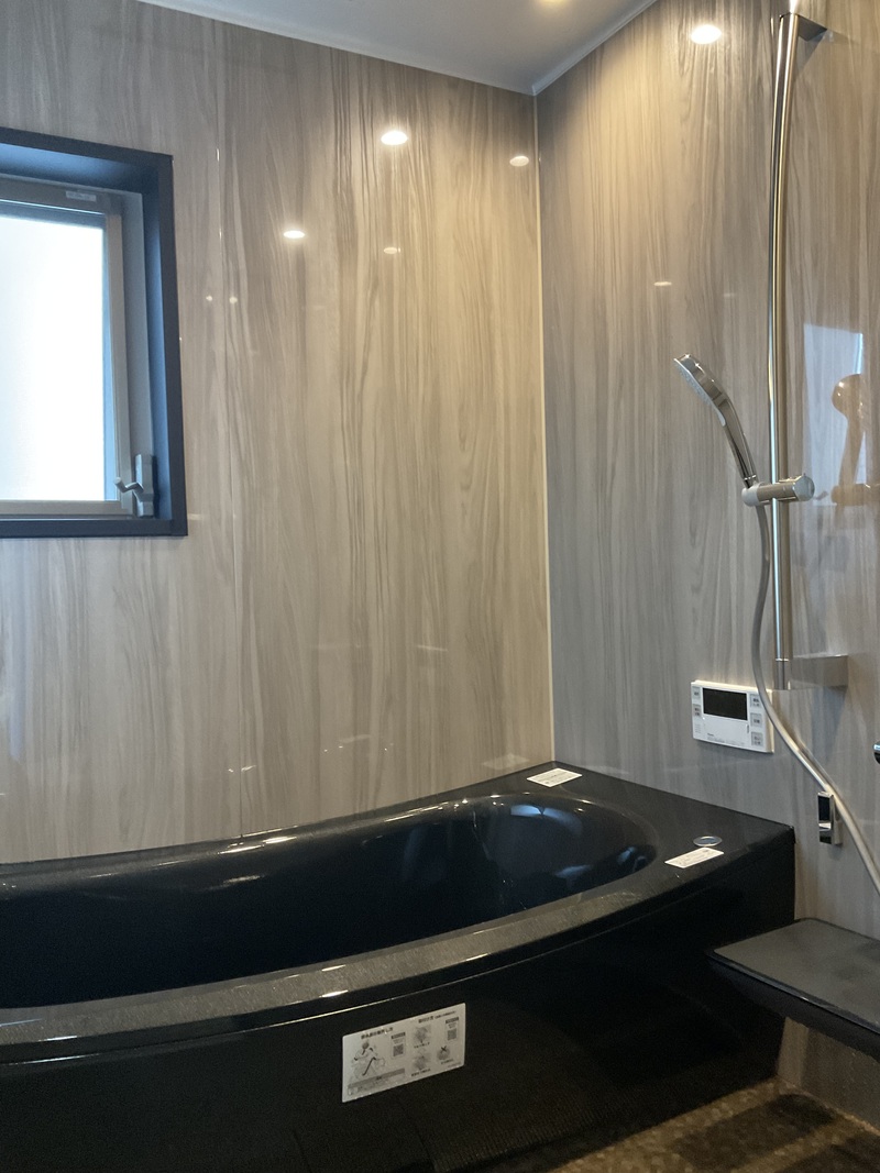 最近では一般的となったアクセントパネルではなく、4面同色プランと黒色の人工大理石浴槽でかっこいい仕上がりになりました。